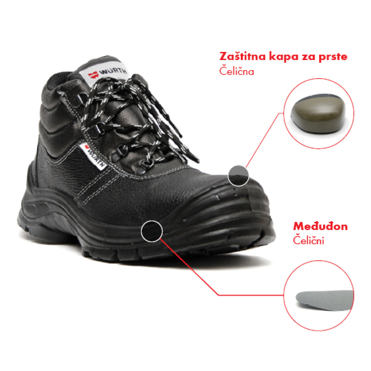 WURTH Pegazus S1P radna cipela (Duboka sa zaštitom) napravljena je od crne kože, sa čeličnom kapom i međuđonom za zaštitu od mehaničkih povreda i proboja.